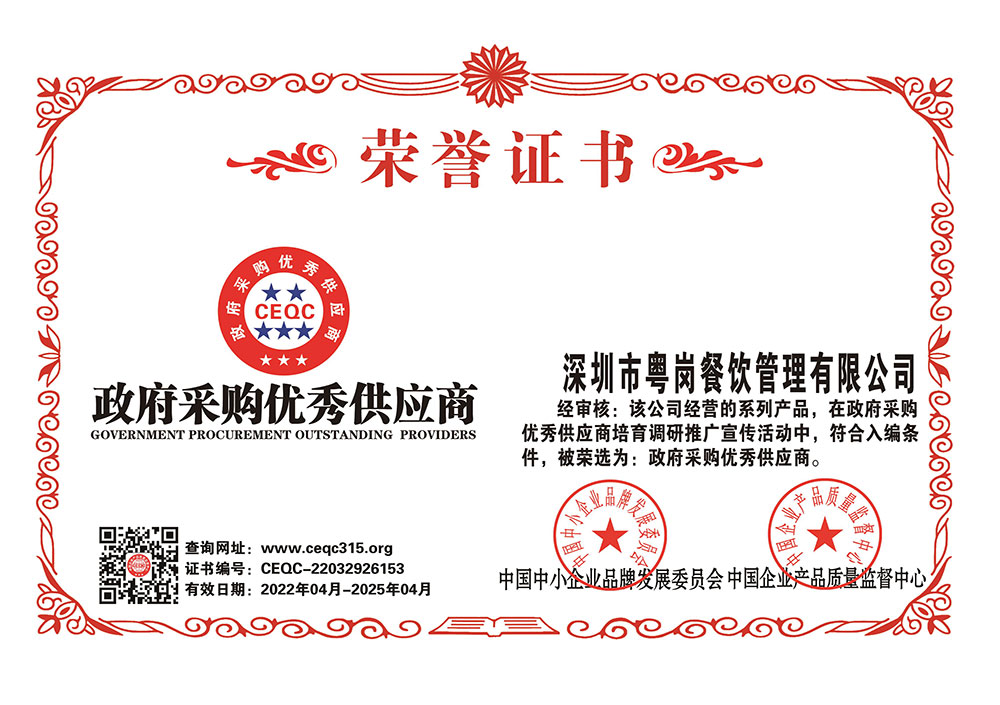 深圳市粵崗餐飲管理有限公司,是一家集蔬菜種植和農(nóng)副產(chǎn)品配送為一體的專業(yè)型餐飲公司,主要為學(xué)校、工廠企事業(yè)機(jī)關(guān)單位提供蔬菜和農(nóng)副產(chǎn)品配送服務(wù)。公司自成立以來始終以質(zhì)優(yōu)價(jià)廉、服務(wù)至上為原則,嚴(yán)格按照ISO:9001國際標(biāo)準(zhǔn)體系進(jìn)行管理。同時(shí)建立了行業(yè)領(lǐng)先的配送中心、大型冷庫和保鮮庫、檢測中心以及專業(yè)化的配送團(tuán)隊(duì),能長期安全、穩(wěn)定、準(zhǔn)時(shí)的配送貨物。我們所有蔬菜均經(jīng)過初步加工、無黃葉,無泥沙等雜質(zhì),利用率達(dá)97%以上...保障向用戶提供的各類食材的衛(wèi)生和質(zhì)量。公司為了適應(yīng)不同客戶的需求,配有專業(yè)人員和配送車輛,實(shí)行“一對(duì)一”的服務(wù)體制,一心一意的為客戶服務(wù),秉承粵崗誠實(shí)守信、服務(wù)第一、客戶至上的服務(wù)標(biāo)準(zhǔn),真正讓客戶花最少的錢吃最好的菜。粵崗多年來何以欣欣向榮,因?yàn)槲覀冎乐挥杏掠趽?dān)當(dāng)責(zé)任,才能承擔(dān)更大的責(zé)任,就是因?yàn)?粵崗員工貫徹公司態(tài)度決定一切、細(xì)節(jié)決定成敗的真理,從質(zhì)量抓起,從服務(wù)做起,才創(chuàng)造了如今的規(guī)?;?yīng)、統(tǒng)一性配送、專業(yè)化服務(wù)的粵崗。
